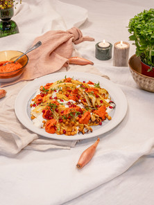 4. Schik de geroosterde spitskool op een schaal. Lepel er wat yoghurtsaus over, voeg de geroosterde kikkererwten toe en werk af met de tapenade van paprika.