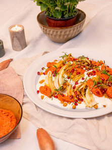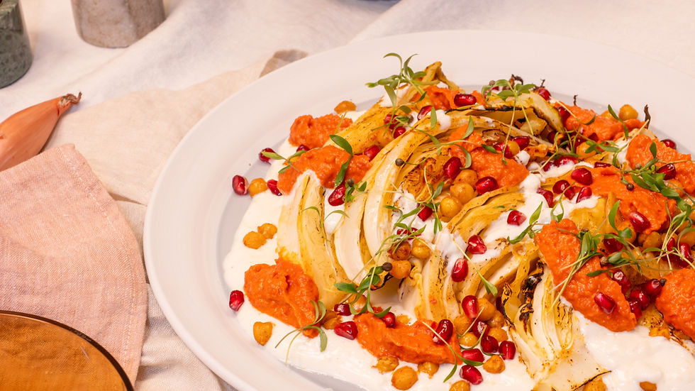 Geroosterde spitskool met kikkererwten, yoghurtsausje en paprika tapenade