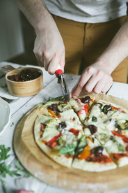 3. Laat de oven voorverwarmen op 250°C. Prik enkele gaatjes met een vork in het deeg, verdeel over het hele oppervlak de pesto van tomaat als basis en begin met toppings naar wens te verspreiden. Als laatste leg je een laagje mozzarella over de toppings. Bak de pizza in de oven voor ongeveer 10-15 minuten. Afwerken met rucola en pijnboompitjes.